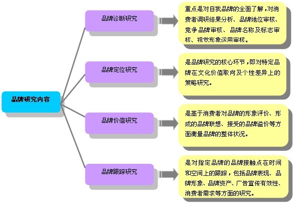 品牌是一種名稱、屬于、標記或他們的組合運用,借以辨認某一銷售者或其產品/服務,并使之同競爭對手的產品和服務區(qū)分開來。品牌研究是采用科學的市場指標評價和價值觀評價方法,洞察消費者對品牌的全面體驗、感受與評價,包括對產品功能、使用環(huán)境、使用者、制造商與經銷商特點等等方面。